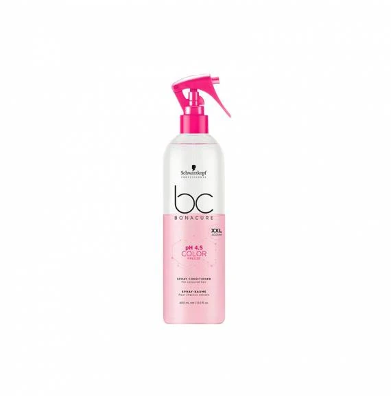 Acondicionador en spray BC Bonacure Color Freeze pH 4.5 de Schwarzkopf desenreda el cabello coloreado o con mechas sin aportarle peso. Optimiza el nivel de pH 4.5, aporta brillo y reaviva el color apagado. Sin aclarado. Formato de 400 ml.