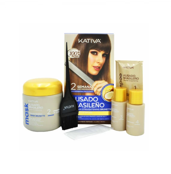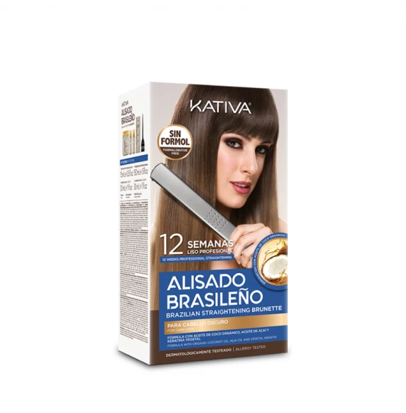 Alisado Brasileño Brunette de Kativa es un tratamiento de alisado del cabello con keratina especialmente recomendado para cabello oscuro,castaños y con diseños de color como balayage, mechas e iluminación. Fórmula sin formol con keratina vegetal, aceite de coco y aminoácidos. El resultado es un cabello liso, con movimiento natural y brillo hasta 12 semanas. Cruelty free, sin sulfatos, sal, parabenos o gluten. El kit incluye: Pre Champú Tratamiento 15 ml, Máscara de alisado x 150 ml, Champú 30 ml, Acondicionador 30 ml, brocha, guantes e instrucciones.