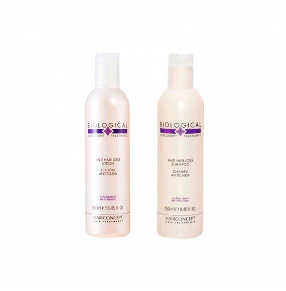 Pack Anticaída Biological de Hairconcept está formado por el champú y loción. Es un tratamiento profesional para cabellos débiles con tendencia a caerse. Ayuda a regenerar el cuero cabelludo y regula la formación de sebo. Disponible en 250 ml cada uno.