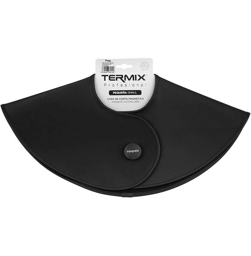 Capa de Corte Magnética Negra Termix: Esta capa profesional, fabricada con mezcla de PVC y poliéster, es perfecta para salones. Su botón imantado permite ajustar la capa al cuello del cliente, facilitando el proceso de corte. Disponible en tamaños grande y pequeño.