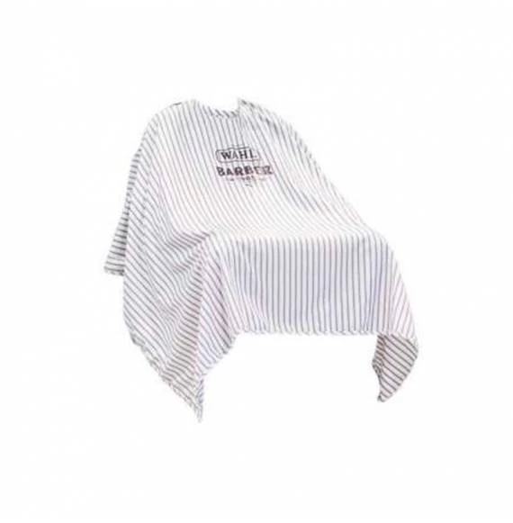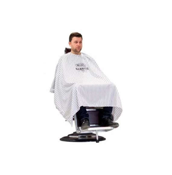 Capa profesional de corte Wahl estilo barber de alta calidad diseñada para salones, barberías y peluquerías. No produce electricidad estática y es resistente al agua. Diseño tradicional a rayas blancas y negras con el logo de Wahl. 100% polyester. Distribuidores oficiales.