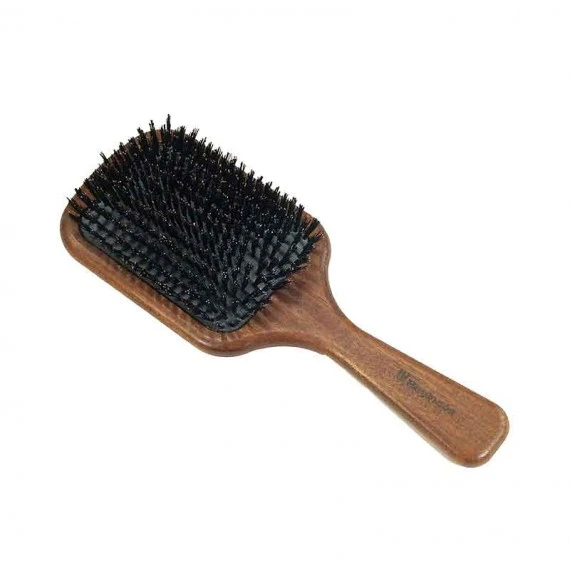 La marca Regincós presenta una línea de cepillos fabricados con madera africana de Mahagony procedente de plantaciones controladas, son acabados y pulidos a mano para garantizar su más alta calidad. Este cepillo Paddel de Regincós está recomendado para peinar y desenredar todo tipo de cabellos aportando brillo y suavidad. Las cerdas son naturales 100% de jabalí reforzadas con mono filamentos de carbón y nylon que proporciona una gran resistencia a las altas temperaturas a la vez que protege el pelo.