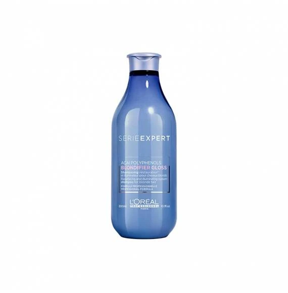 Champú Blondifier Gloss de L’Oréal Professionnel Serie Expert rejuvenece, nutre e ilumina el cabello rubio. Su fórmula elimina el 65% de las partículas de polución del pelo y aporta brillo. Con filtro UV. Enriquecido con Moras de Acai. Disponible en dos tamaños.