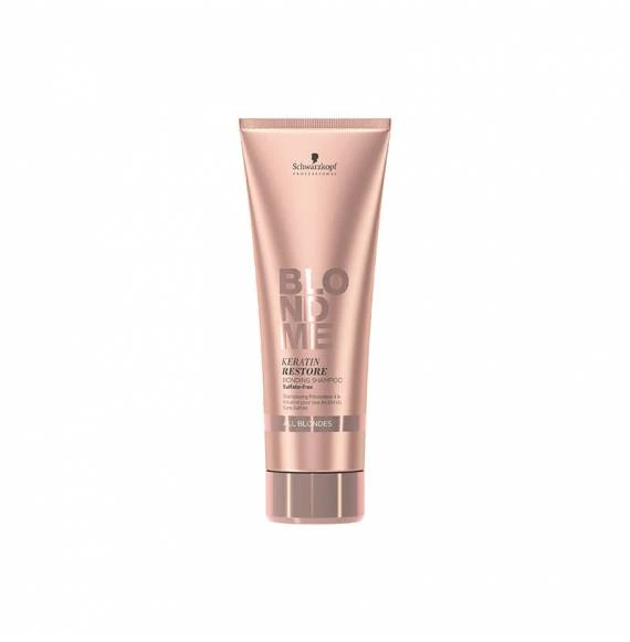 Keratin Restore de la línea BlondMe de Schwarzkopf Professional es un champú profesional que repara el cabello tratado y ayuda a mantener el cabello rubio. Fortalece las zonas debilitadas y suaviza las zonas porosas por la decoloración o el tinte. Enriquecido con keratina y libre de sulfatos. Ideal para todos los cabellos rubios. Tamaño de 250 ml.
