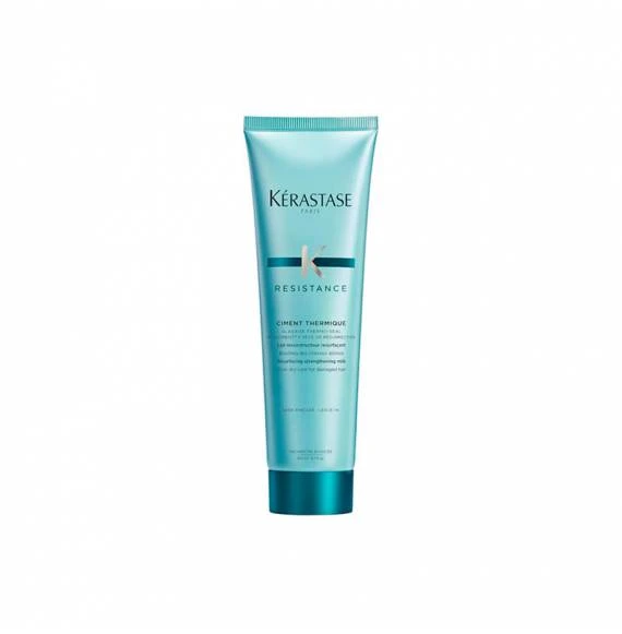 La marca Premium Kérastase crea el programa de belleza Résistance Thérapiste específico para reparar el caballo dañado o tratado químicamente en tres pasos: champú, acondicionador o mascarilla y styling, o lo que es lo mismo: bañar, tratar y texturizar el pelo. Ciment Thermique de Kérastase corresponde al número 3 de este programa y se trata de un crema reconstructora termoprotectora para el cabello debilitado y dañado. Protege el cabello del calor hasta los 180 °, facilita el secado con secador, protege y repara el cabello dañado y aporta brillo y suavidad. Su fórmula está diseñada con la tecnología Vita-Ciment que contiene: Ceramida que fortalece la fibra capilar desde el interior, Vita Topseal que recrea la capa protectora natural del cabello y savia de la planta de resurrección que regenera el pelo. Modo de empleo: Aplica una pequeña cantidad sobre el cabello lavado o secado con una toalla y sécalo con secador o plancha. Se recomienda utilizar el resto de productos de la gama Résistance.