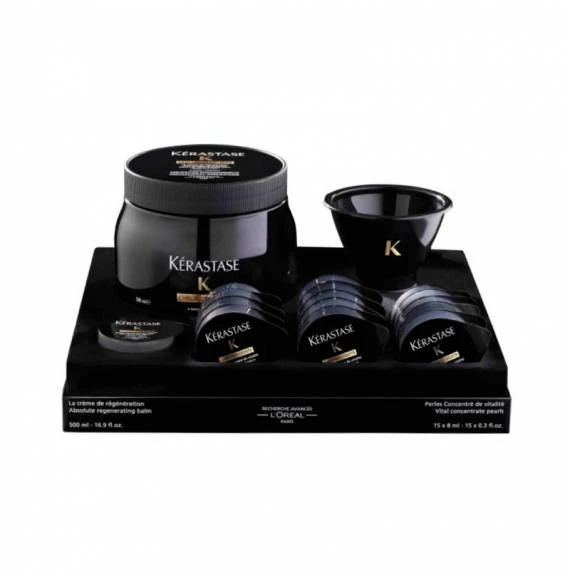Kérastase Chronologiste Cremé Regénération es un tratamiento de lujo que regenera todo tipo de cabello. Es un ritual de regeneración capilar de excepción elaborado con un concentrado de activos marinos y vegetales y perlas de Caviar Mimético. El resultado es un cabello suave, flexible y brillante y una fibra capilar renovada, nutrida y fortalecida. El cofre está formado por: la Mascarilla Cremé Regeneradora de 500 ml, 15 monodosis de concentrado de perlas de caviar mimético de 8 ml Tarro de 500ml, un Molinillo-compresor y una espátula.