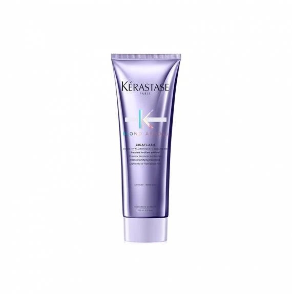 Cicaflash de la línea Blond Absolu de Kérastase es un acondicionador en gel con matices en lavanda que nutre y restaura el cabello sensibilizado. Ideal para todos los tonos de cabello decolorado. El cabello queda hidratado, suave, fortalecido y luminoso. Formulado con ácido hialurónico y flor de Edelweiss. Efecto matizador. Formato de 250 ml.