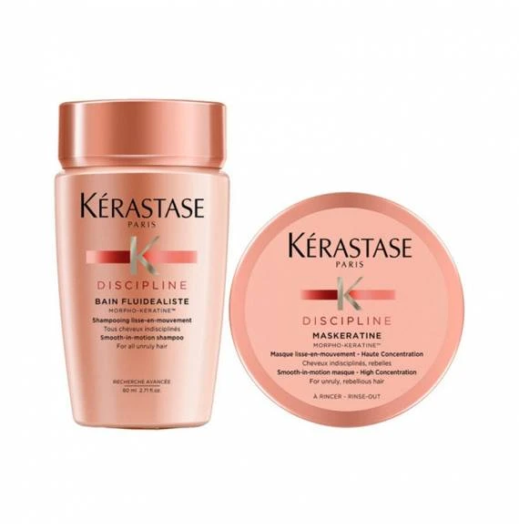 Pack de Viaje Kérastase Discipline es ideal para cuidar el cabello difícil de manejar, grueso, rebelde y encrespado que buscan alisado. El pack está formado por el champú Bain Fluidealiste en formato de 80 ml y la mascarilla Maskeratine en tamaño de 75 ml. Incluye de regalo un práctico neceser. Su fórmula aporta alisado, suavidad, fluidez y movimiento. Ideal para llevártelo de viaje como equipaje de mano.