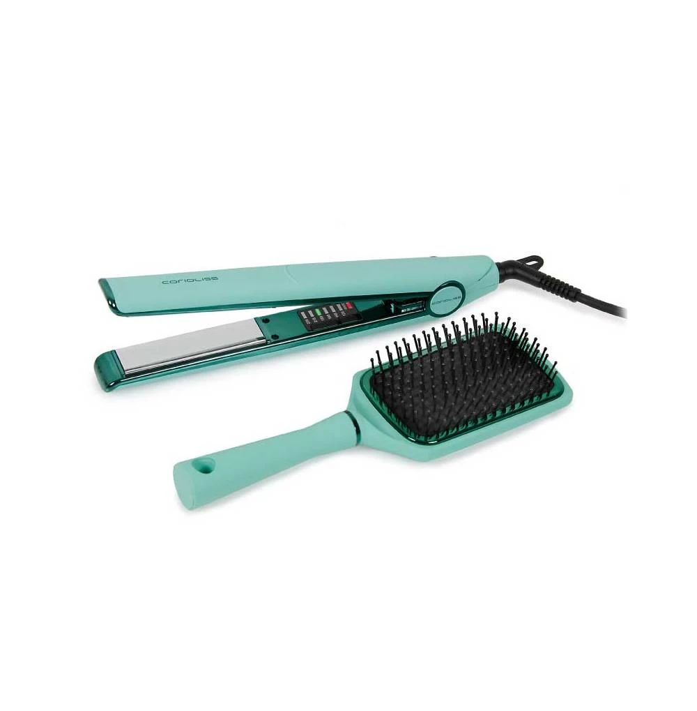Domina tu peinado con el Corioliss Kit C1 + Cepillo Paddle Mint Green Collection. Su plancha profesional con placas de titanio deja tu cabello liso y brillante en minutos, mientras que el cepillo paddle desenreda con suavidad sin romper la fibra capilar. Una combinación imprescindible para un cabello impecable!