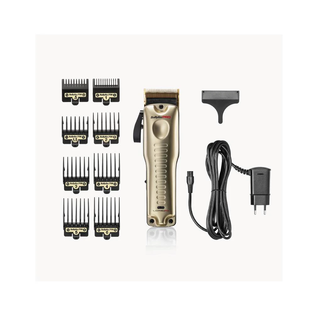 YA ESTÁ AQUÍ MÁQUINA DE CORTE BABYLISS PRO LOPROFX GOLD CLIPPER FX825GE con un potente motor digital que alcanza 6800 rpm y 516,800 golpes/min, esta cortadora ofrece cortes precisos. Su cuchilla de titanio de 45 mm con ajuste zero gap proporciona durabilidad, hipoalergenicidad y realiza cortes de desfilado y fades con precisión profesional. Con un brazo cónico de 5 retenes y 8 peines guía, garantiza versatilidad en estilos. Su diseño ergonómico brinda control perfecto para resultados profesionales.