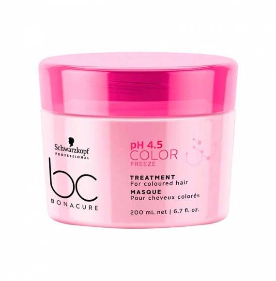 Schwarzkopf Professional presenta la línea pH 4.5 Color Freeze, la primera línea capilar que el sella el color para una pérdida cero de la coloración gracias a la tecnología patentada por la marca pH 4.5 Balancer que imprime los pigmentos del color dentro de la matriz del cabello para un color perfecto durante mucho más tiempo. En combinación con la Tecnología Cell Perfector, la superficie del pelo se sella a la perfección proporcionando protección frente a las agresiones externas como el agua o el secado con secador. Mascarilla BC Bonacure Color Freeze pH 4.5 de Schwarzkopf repara intensamente el cabello coloreado, equilibra el pH del pelo para fijar los pigmentos del color consiguiendo así un color intenso y duradero. Su fórmula contiene queratina hidrolizada para rellenar los vacíos estructurales desde la capa externa del cabello hasta el córtex. Modo de empleo: Aplicala sobre el cabello secado con toalla dejándolo actuar 10 minutos y aclara abundantemente.