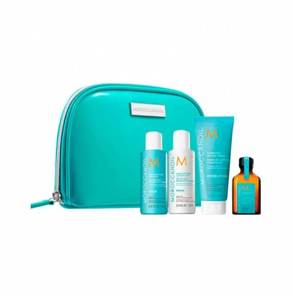 Moroccanoil Repair Travel Kit es un set ideal para cuidar el cabello dañado y quebradizo por tratamientos químicos o el uso de la plancha o secador. Está formado por el champú Repair 70 ml, acondicionador Repair 70 ml, Crema Hidratante para Peinar 75 ml y el Tratamiento 25 ml. De regalo incluye un neceser de viaje. Sin sulfatos, fosfatos ni parabenos.