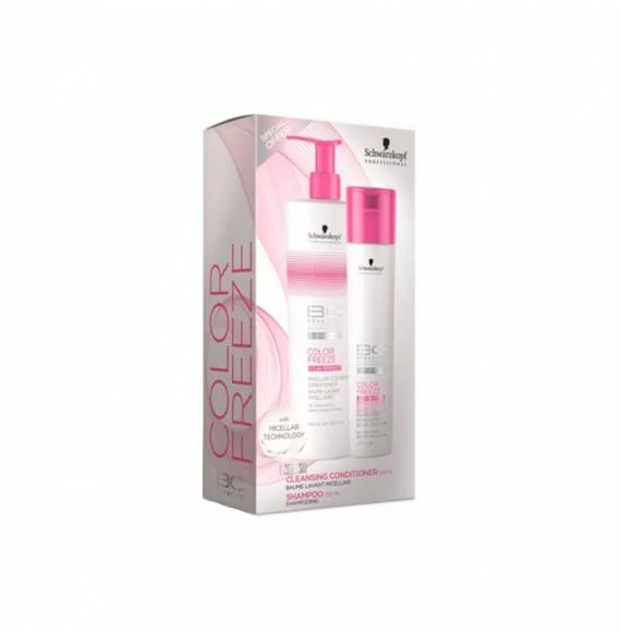 Pack Bonacure Color Freeze de Schwarzkopf está formado por el champú y acondicionador micelar que mantienen el color de los cabellos coloreados o tintados. Con filtro UV. Fórmula suave sin sulfatos.