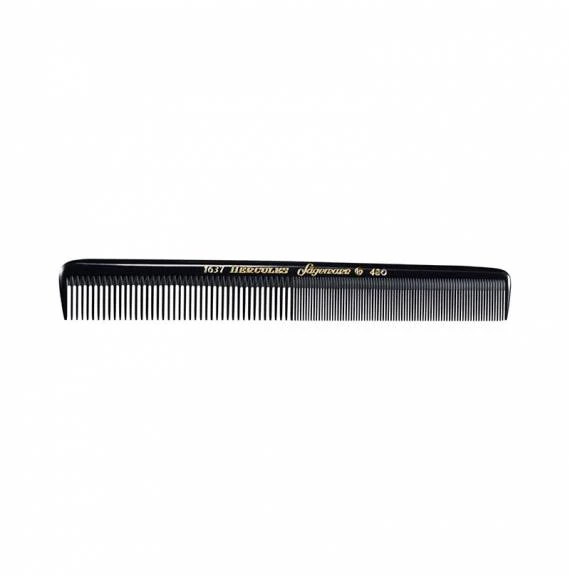 Peine profesional de la marca Hercules Sägemann Ag 1637-480 con un largo de 21,6 cm. División de dientes gruesos y finos ideal para cortar el cabello. Fabricado, cortado y pulido a mano. Ergonómico, resistente al calor y a los químicos. Fabricado con ebonita, un goma natural similar en flexibilidad y resistencia al marfil o cuerno. Antiestático.