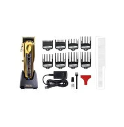 ¡Nueva! Wahl Magic Clip Gold Cordless es la última máquina edición 2023 que ha sacado la marca. Esta espectacular clipper de color dorado, cuenta con una cuchilla extremadamente fuerte de dientes escalonados y tecnología de hoja crujiente que avisa cuando el corte está listo. Se puede usar con o sin cable. La batería de litio tiene una duración de más de 100 minutos. Uno de los motores más potente que ofrece un máximo rendimiento en todos los tipos de cabello, incluyendo hasta el más grueso. Incluye 8 peines Premium, base de carga, aceite lubricante, cepillo de limpieza y peine para peinar.
